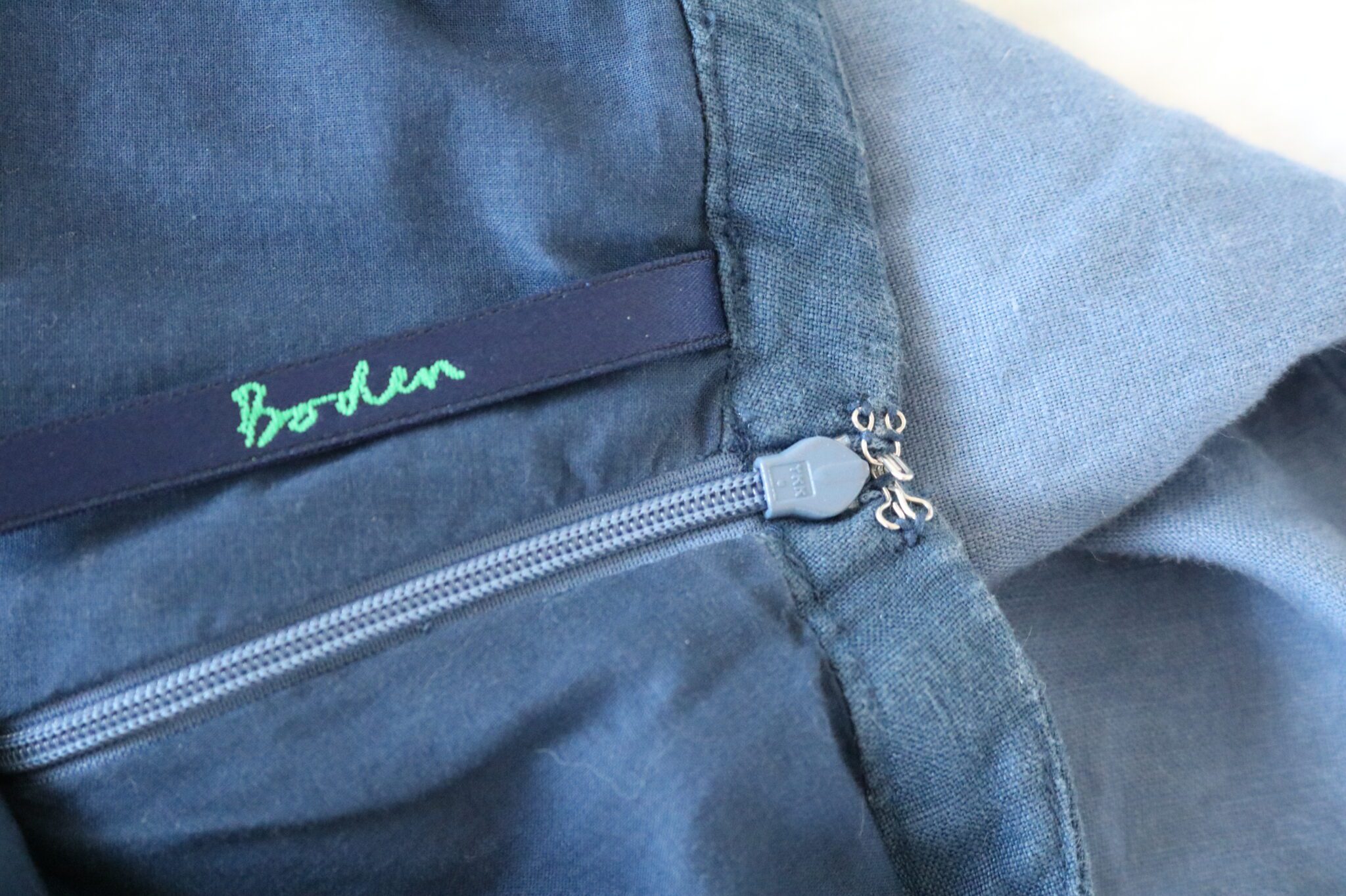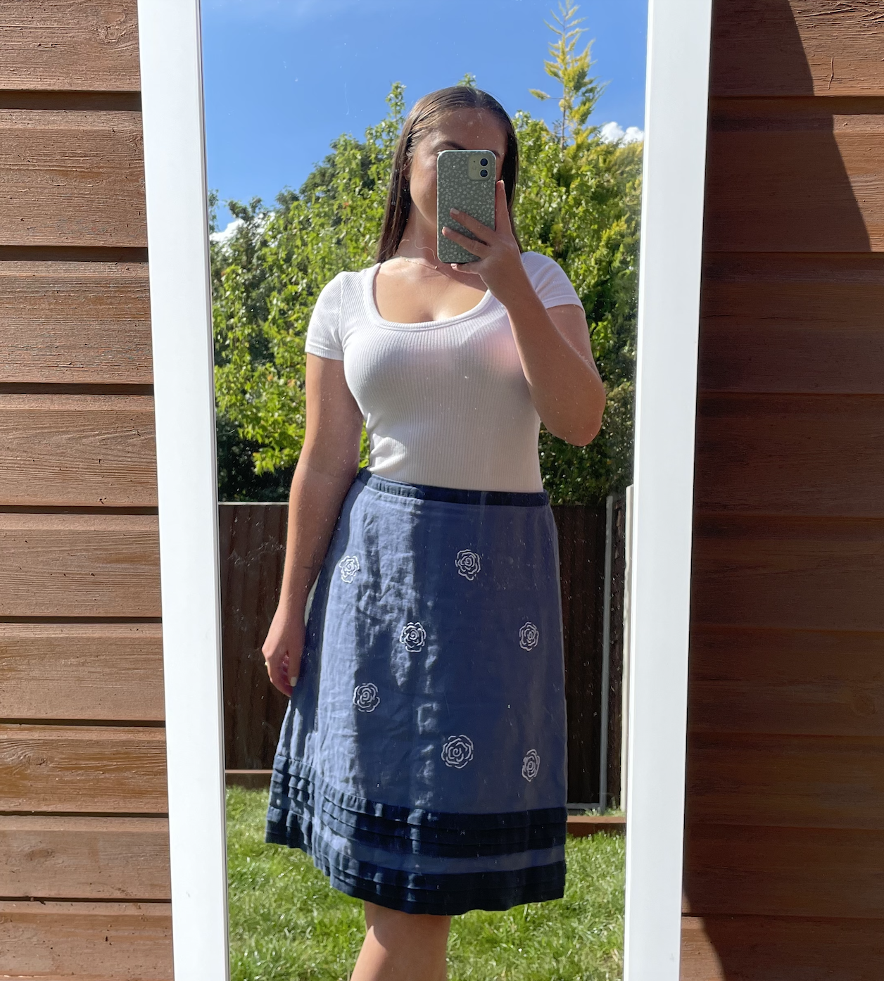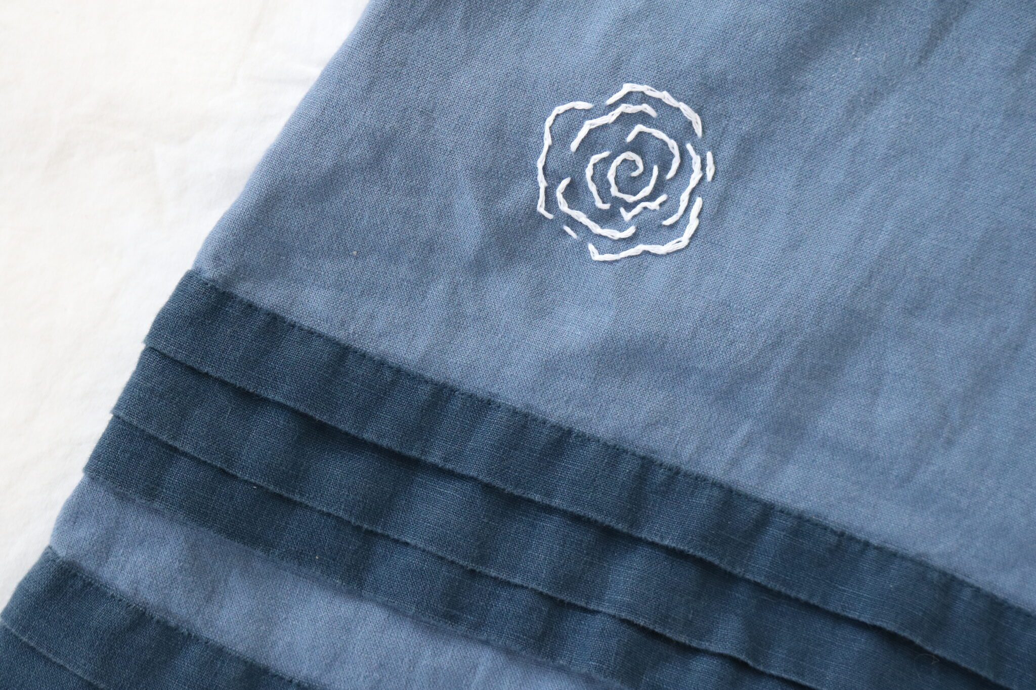 This one-of-a-kind blue linen and cotton skirt has been given new life as part of the Zoë Ware Reclaimed Collection. Originally from Boden, it’s been lovingly hand-embroidered with delicate white roses, adding ever-lasting floral detail to a classic piece.