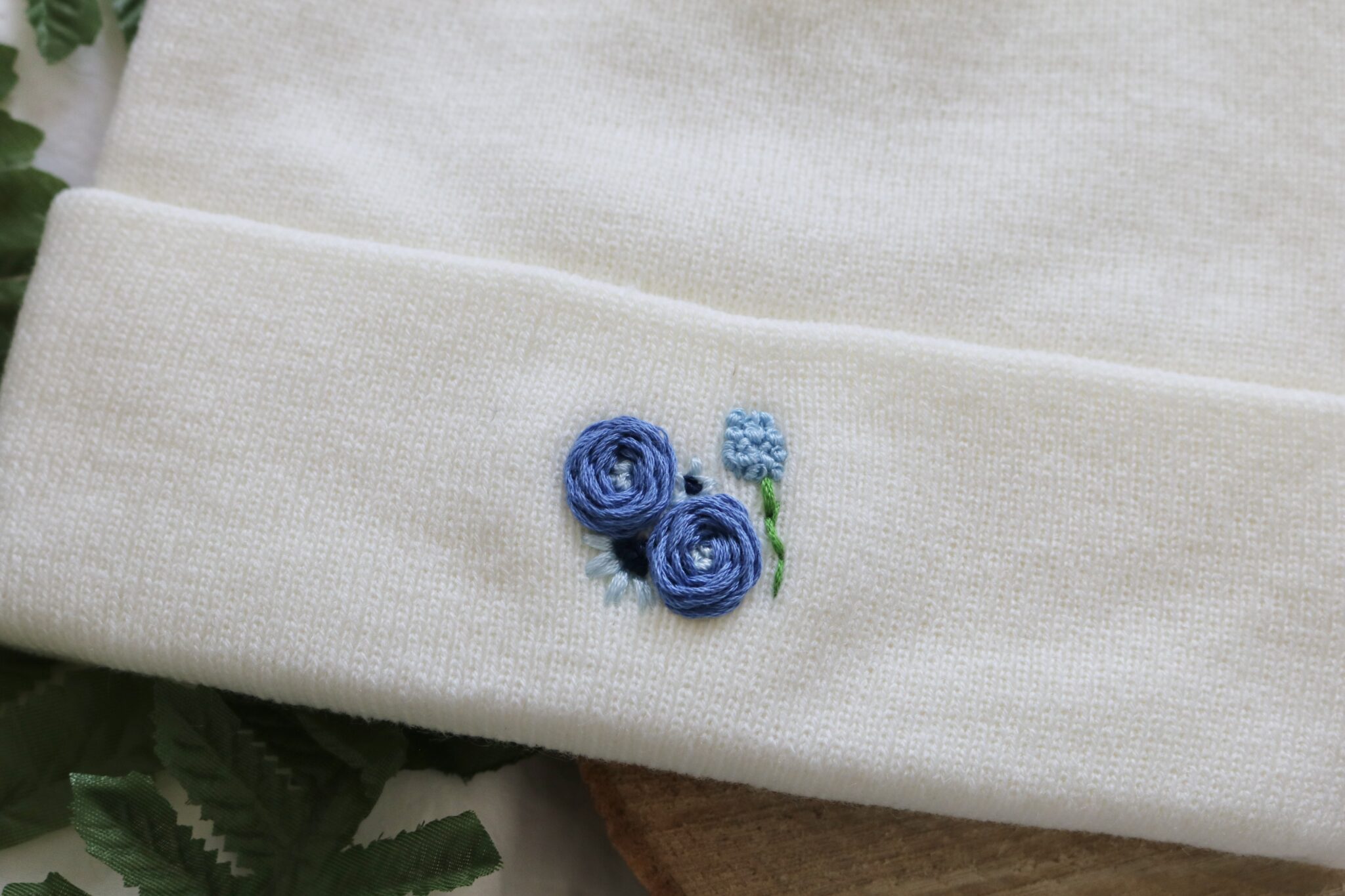 Embroidered by hand with delicate blue roses, hydrangeas, and cosmos, this design is a one-of-a-kind piece — there’s only one available. The detailed blue stitching adds a subtle pop of colour to the crisp white knit, making it a beautiful statement for everyday wear or a thoughtful handmade gift.