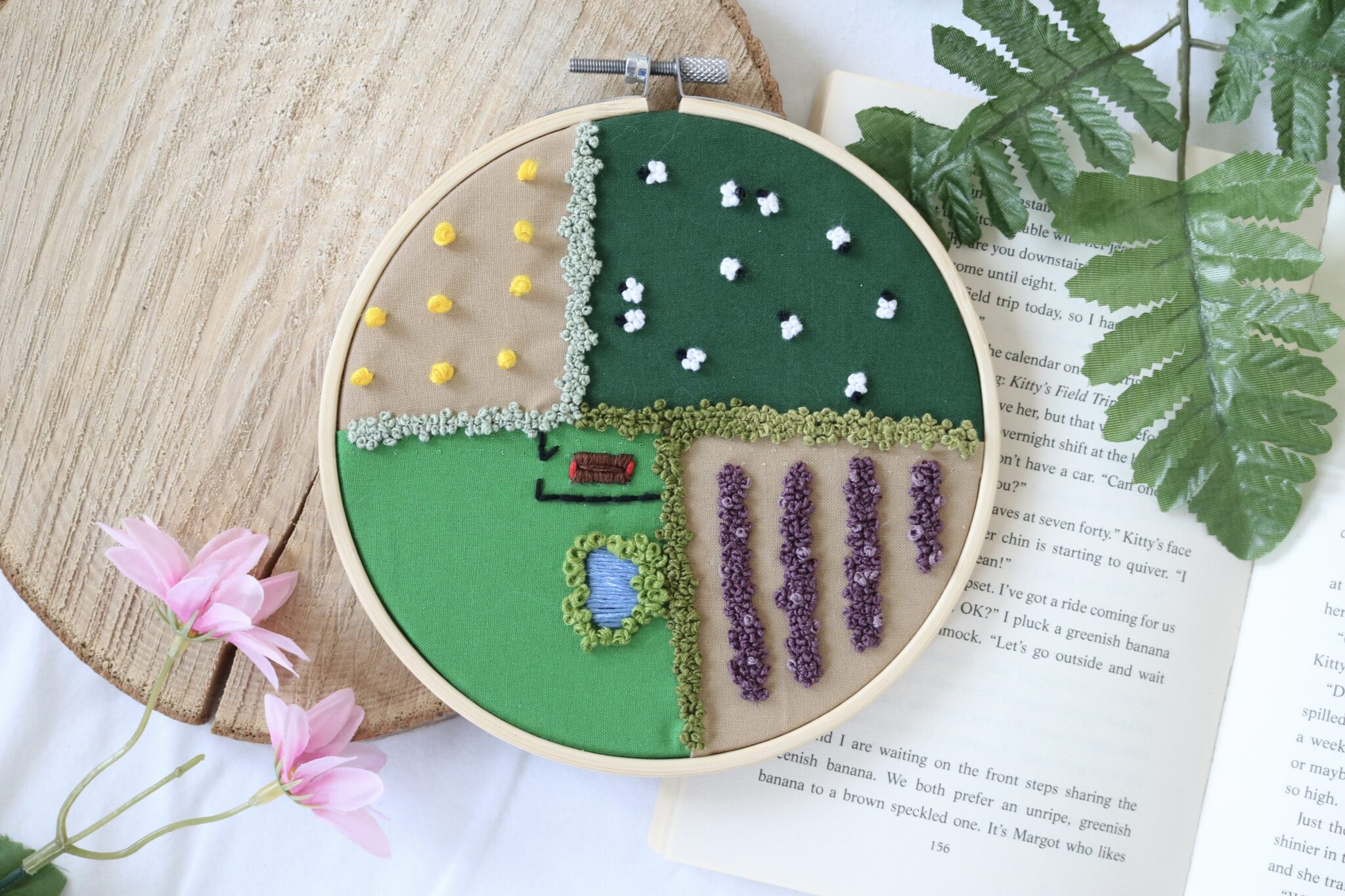 Made using carefully sewn sections of brown and green fabric, the design is divided into fields, each one telling its own story. In one, tiny yellow hay bales sit scattered across the land, while another is dotted with sheep calmly grazing. A grassy field holds a small barn and pond, and alongside it, neat rows of lavender bring a soft contrast in colour and texture.