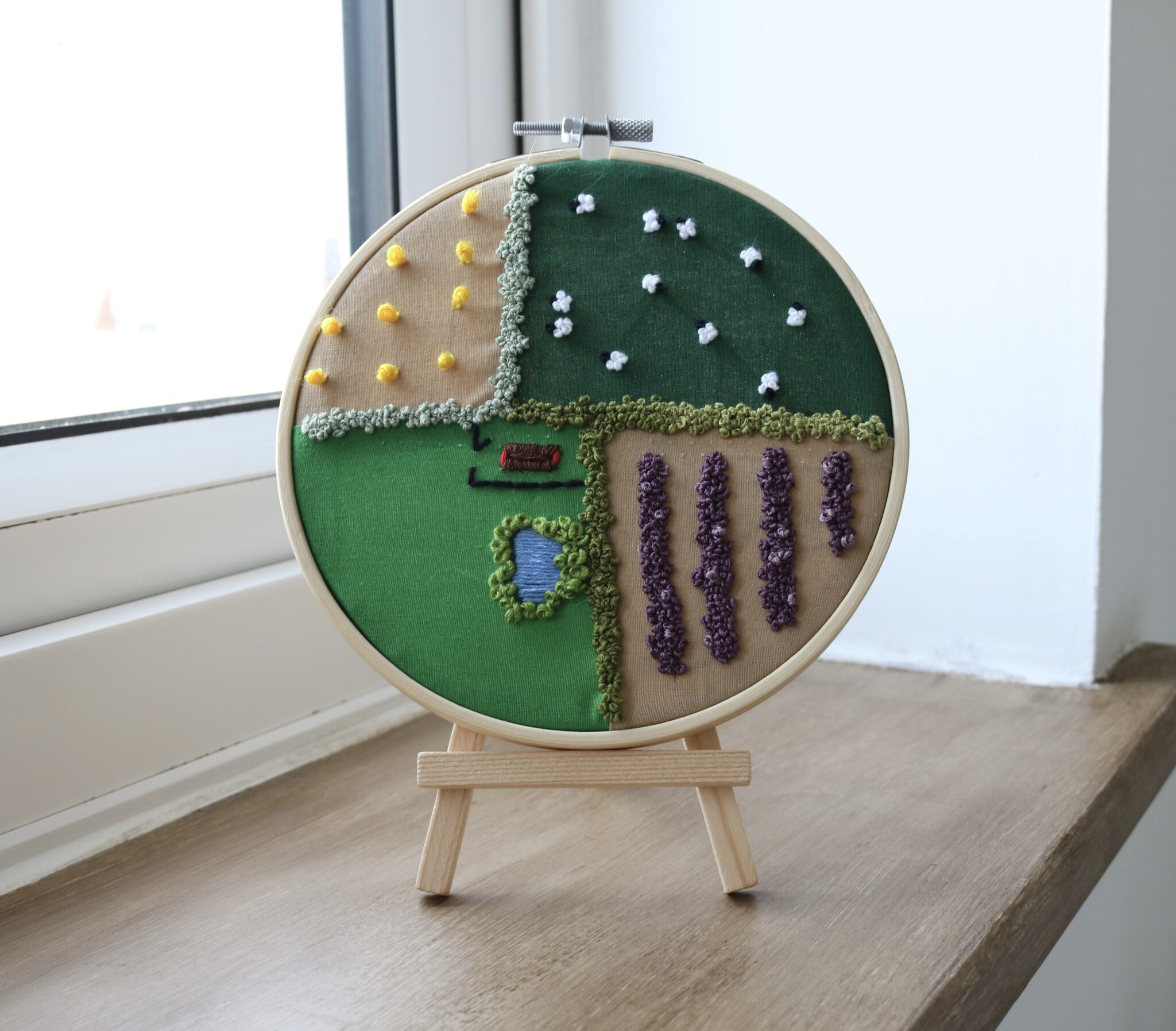 This countryside fields embroidered hoop art is inspired by the patchwork fields of the Hampshire countryside. Capturing a quiet, aerial view of rural life in thread and fabric.