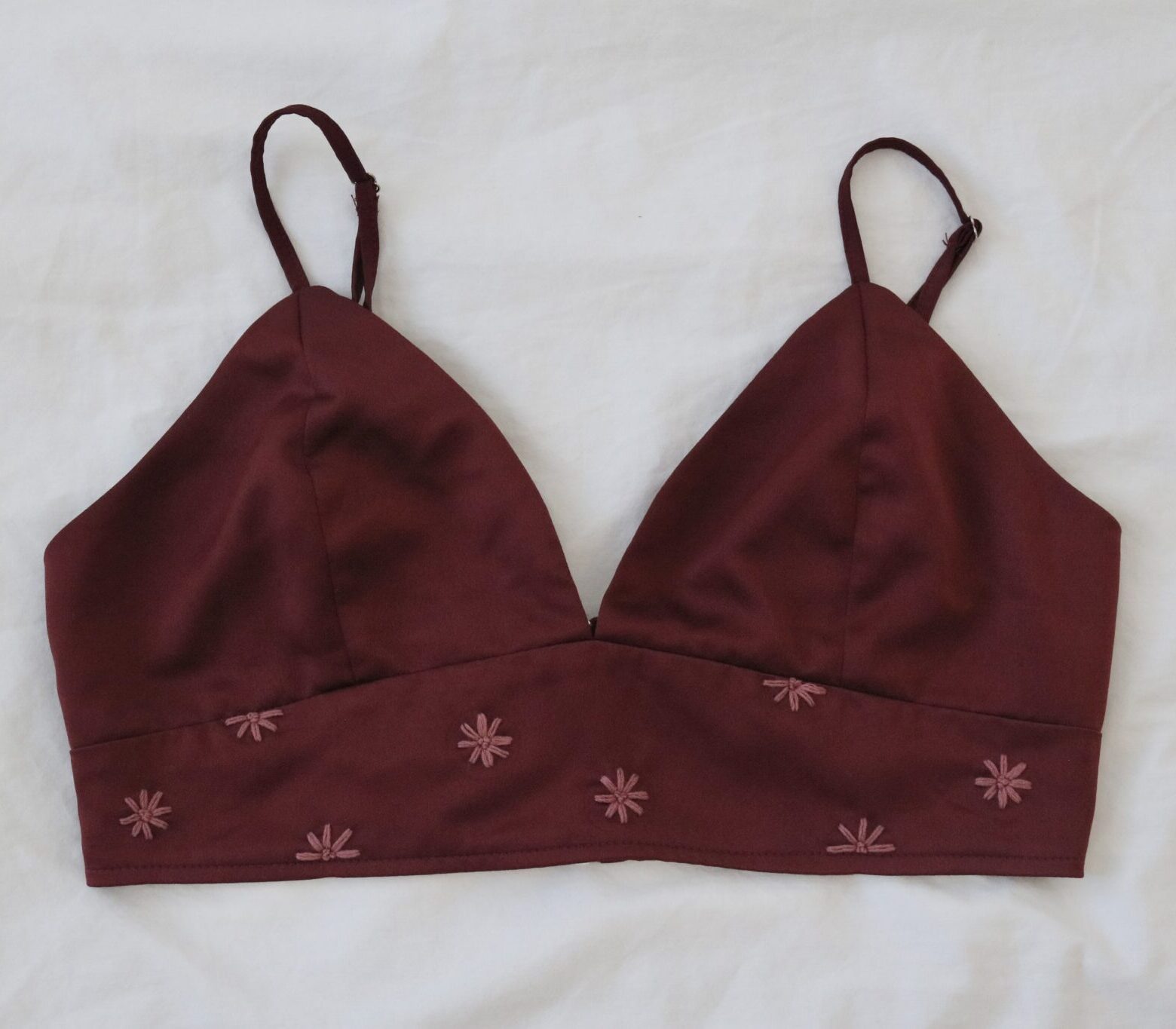 Introducing the Crimson Blossom Bralette, a captivating piece that combines sweet and sexy. Created from deep red wine-coloured satin, this bralette is soft, silky, and irresistibly comfortable. Hand embroidered with intricate flowers in matching hues, the Crimson Blossom Bralette brings a touch of unique beauty to your lingerie collection.