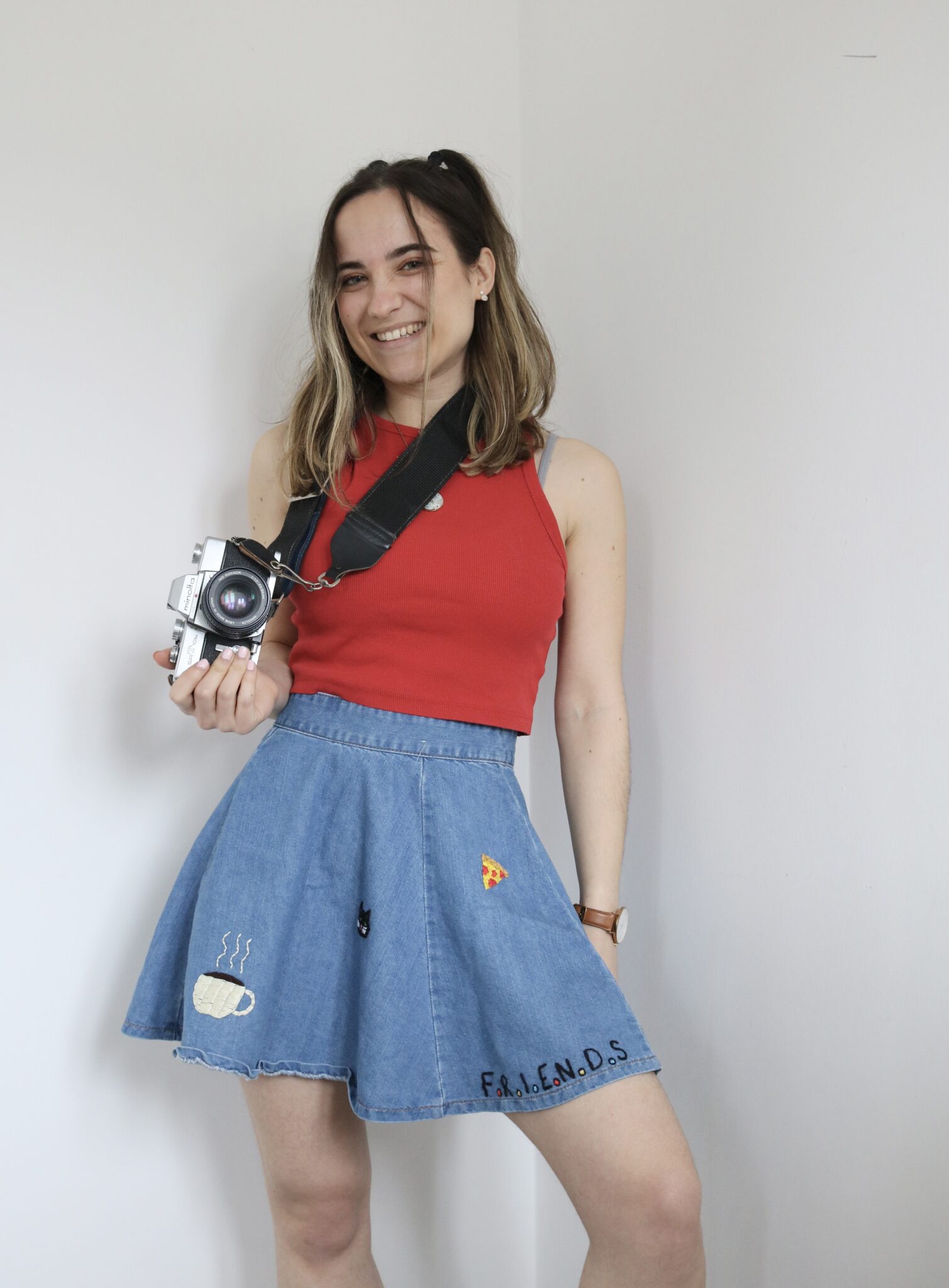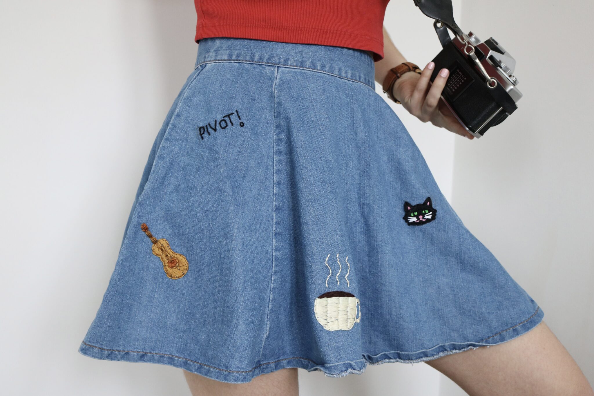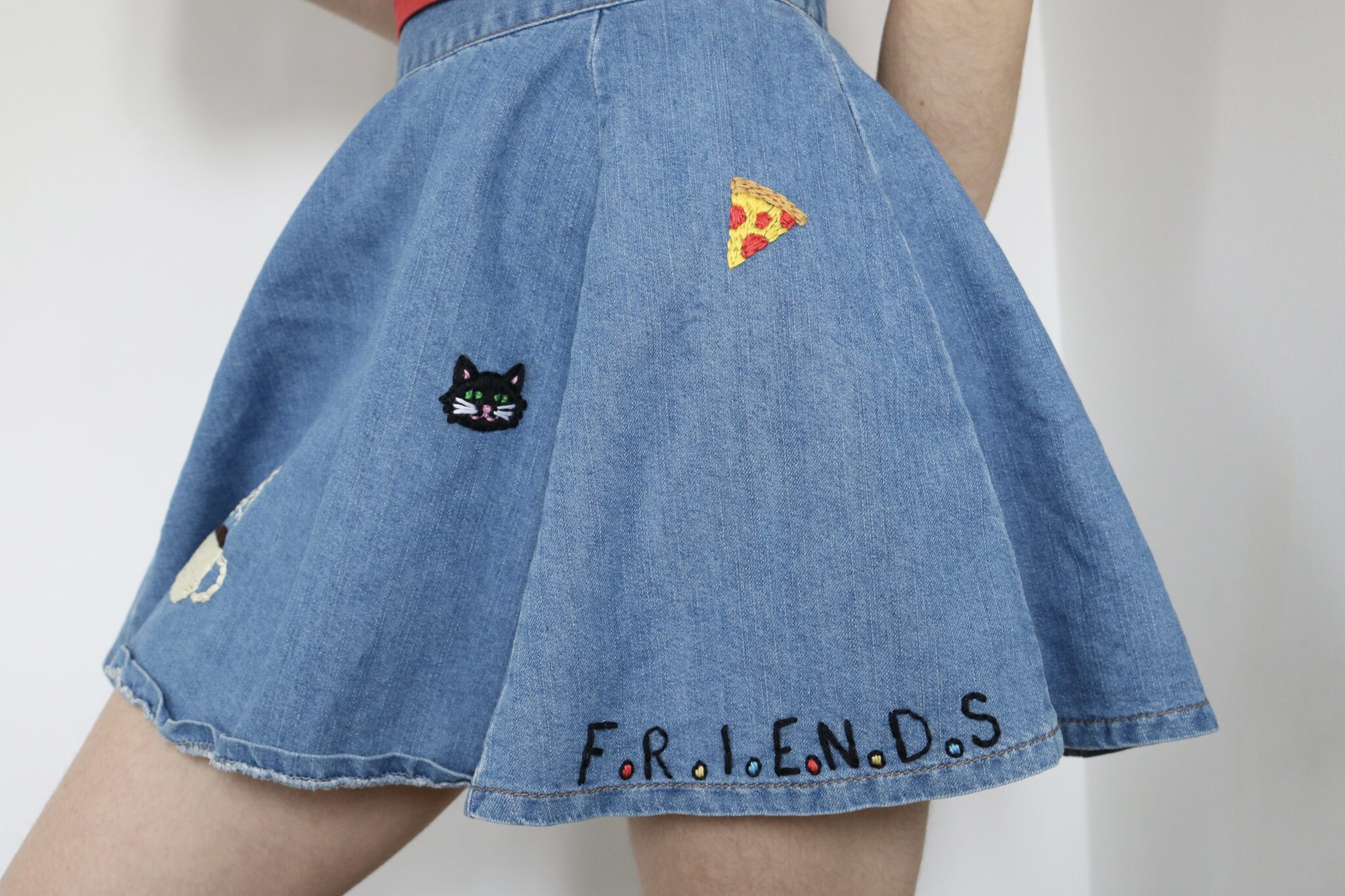 This denim FRIENDS inspired skirt is the perfect piece for fans of the tv show. Channel your inner Phoebe with this unique up-cycled piece, part of the Reclaimed collection, we all know Phoebe loved a good thrift shop! This skirt is hand embroidered with the ‘Friends’ logo, ‘pivot’, a coffee mug, a cat, Phoebe’s guitar, and a slice of pizza.
