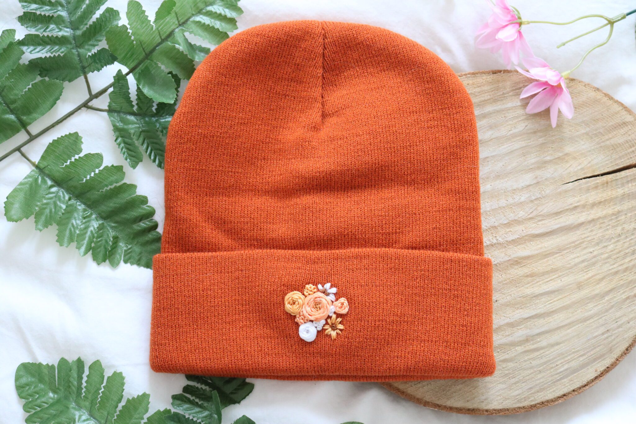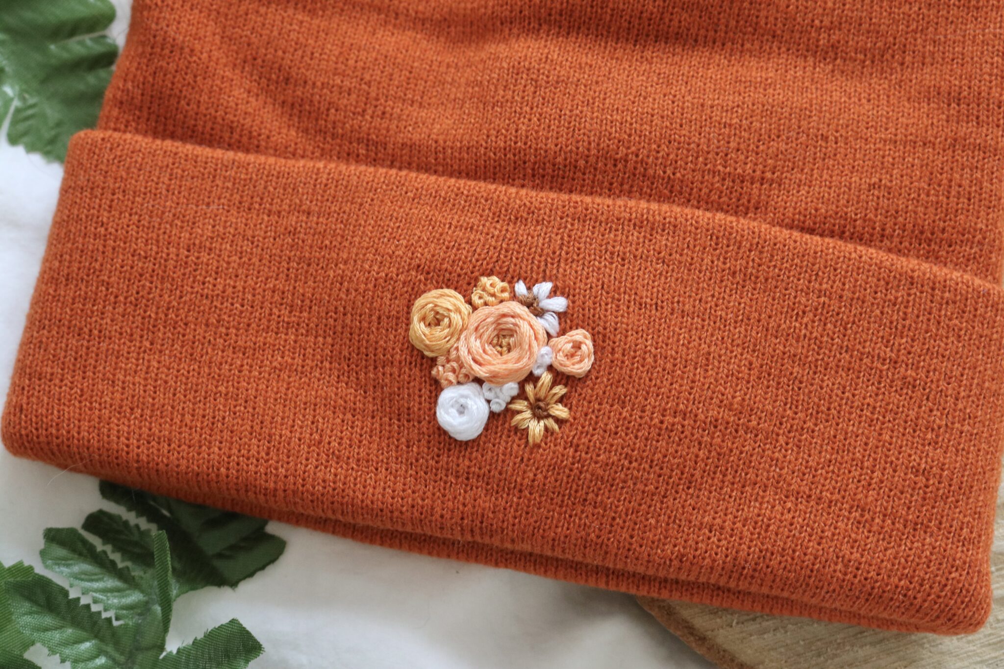 Warm, cosy, and full of autumn charm — this rust orange hand embroidered beanie is a celebration of the season’s rich, earthy tones.