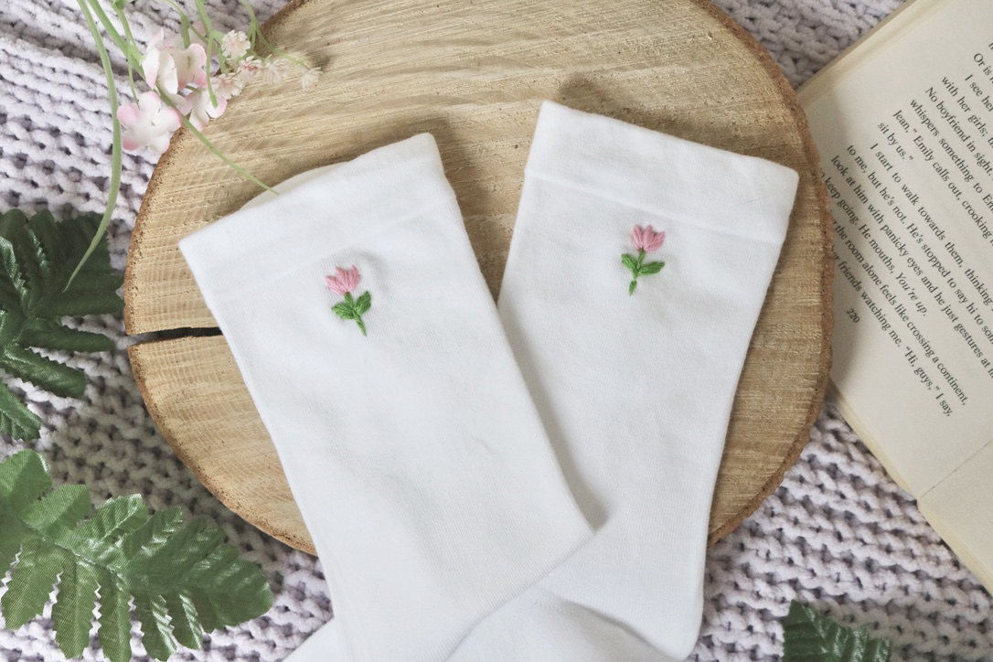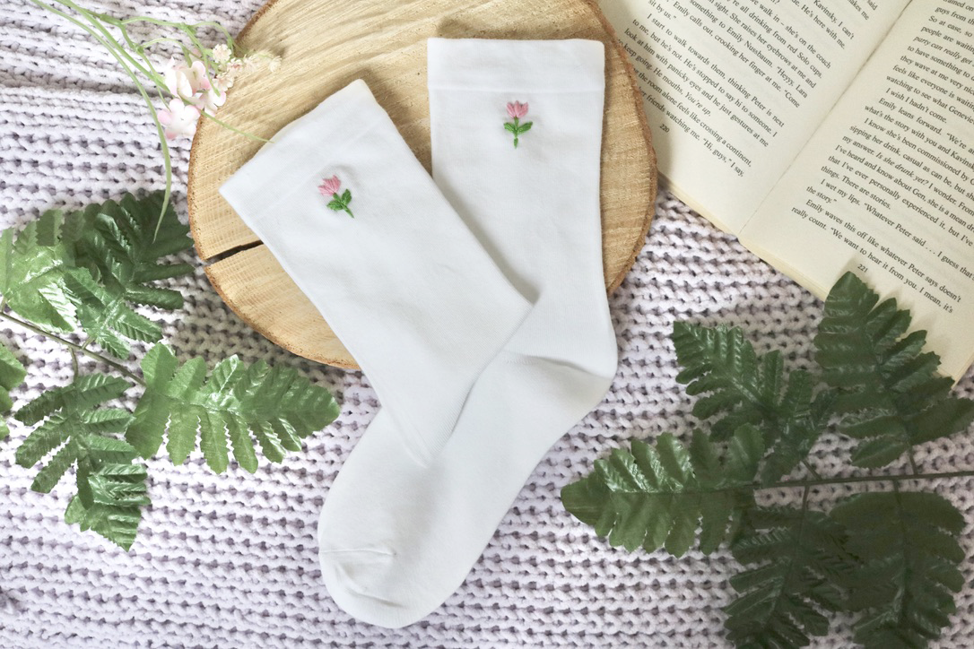Made from comfortable white cotton socks and hand embroidered with pink tulip flowers on each sock, this design feels aesthetic and fashionable. The delicate floral embroidery looks especially lovely paired with trainers, ballet flats, or loafers, adding a subtle detail that still stands out.