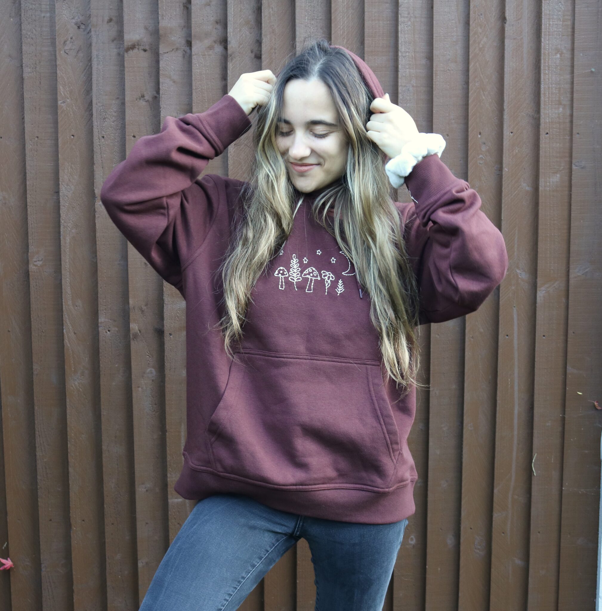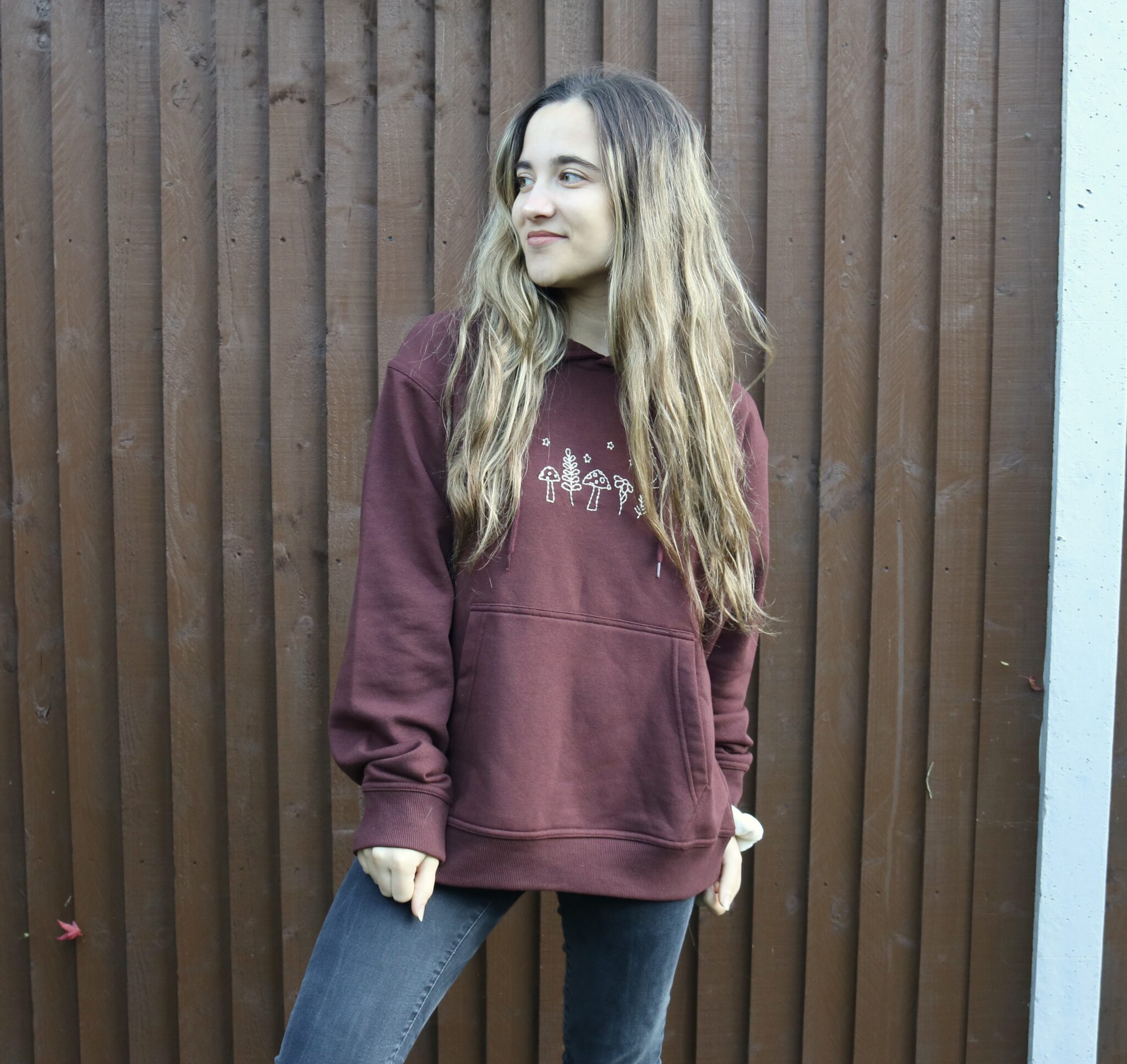 Wrap yourself in cozy, forest magic with our Starlit Forest Hoodie! This deep, chocolate brown hoodie is hand embroidered with delicate mushrooms, leafy plants, stars, and a crescent moon, creating a sweet nighttime woodland scene. Perfect for chilly evenings, this hoodie combines comfort with a celestial design that’s sure to stand out.