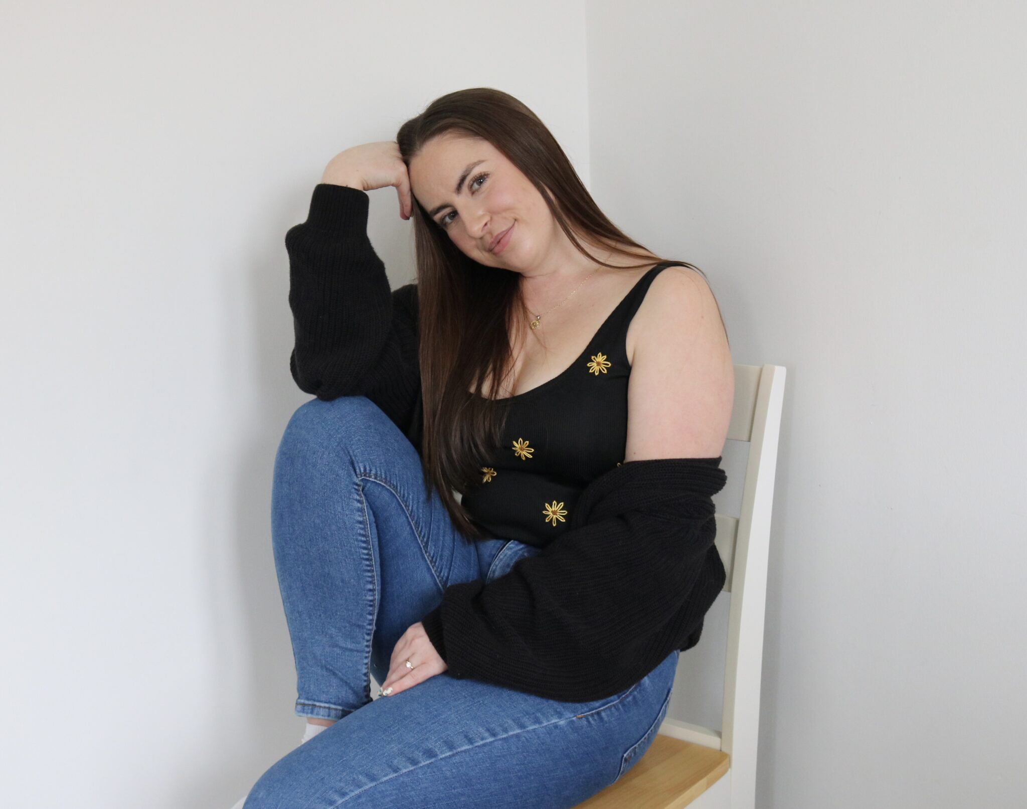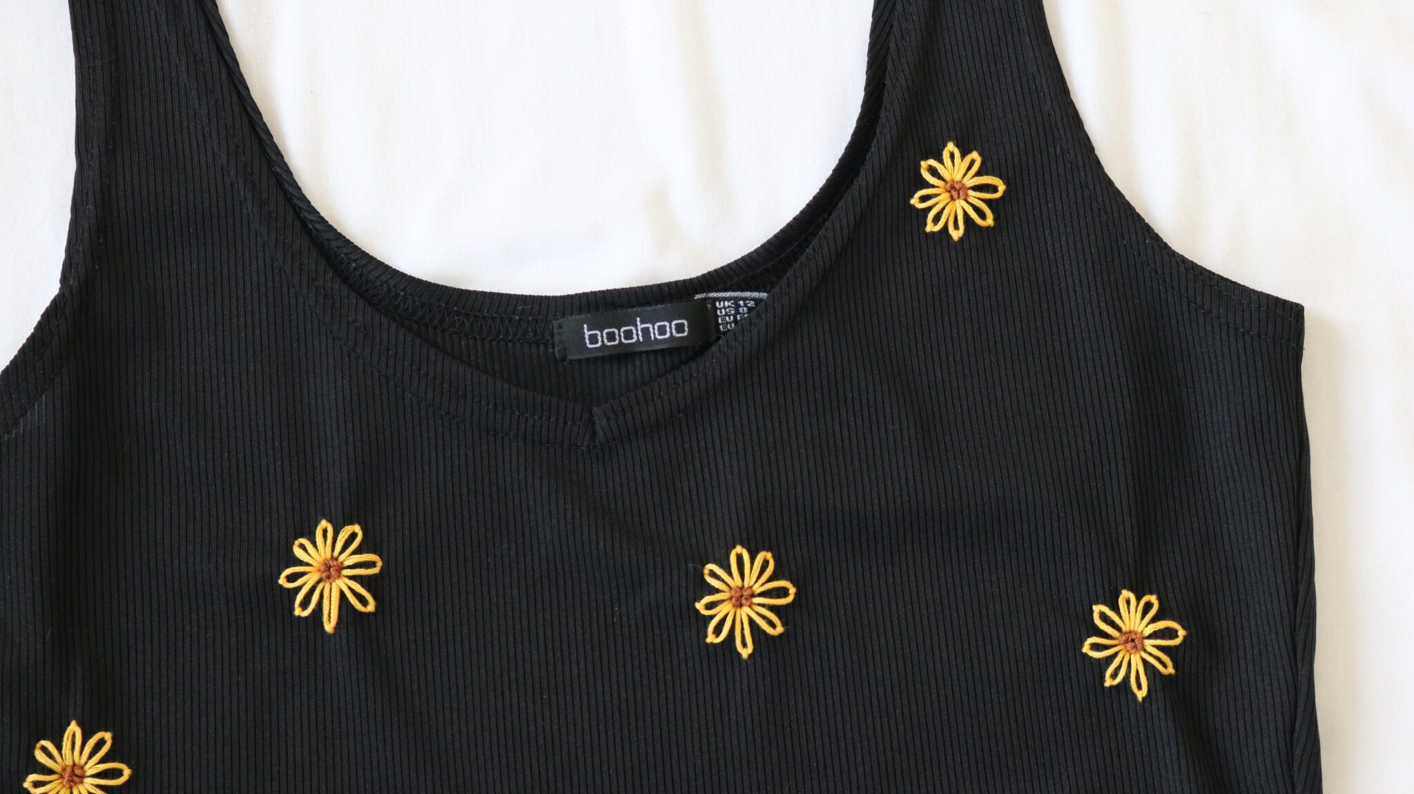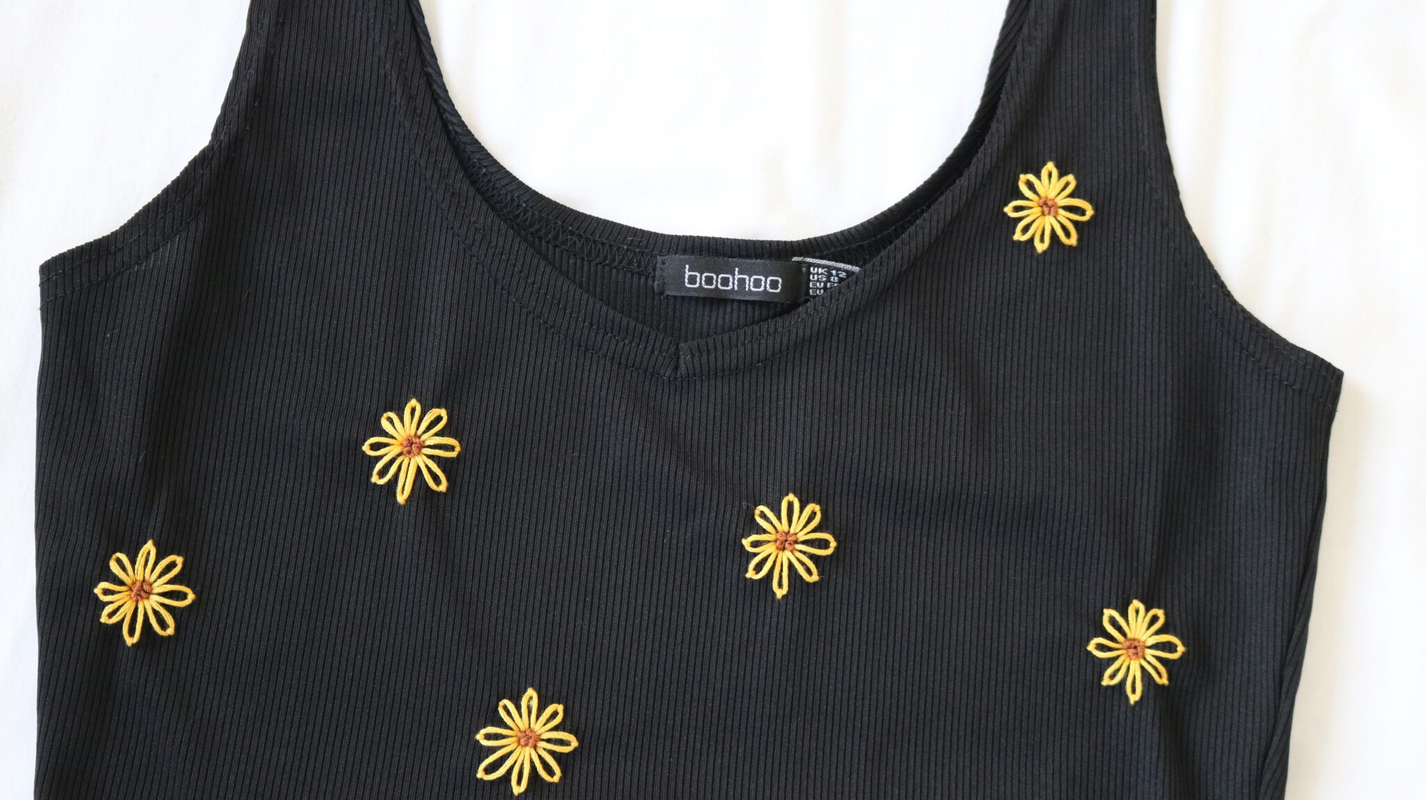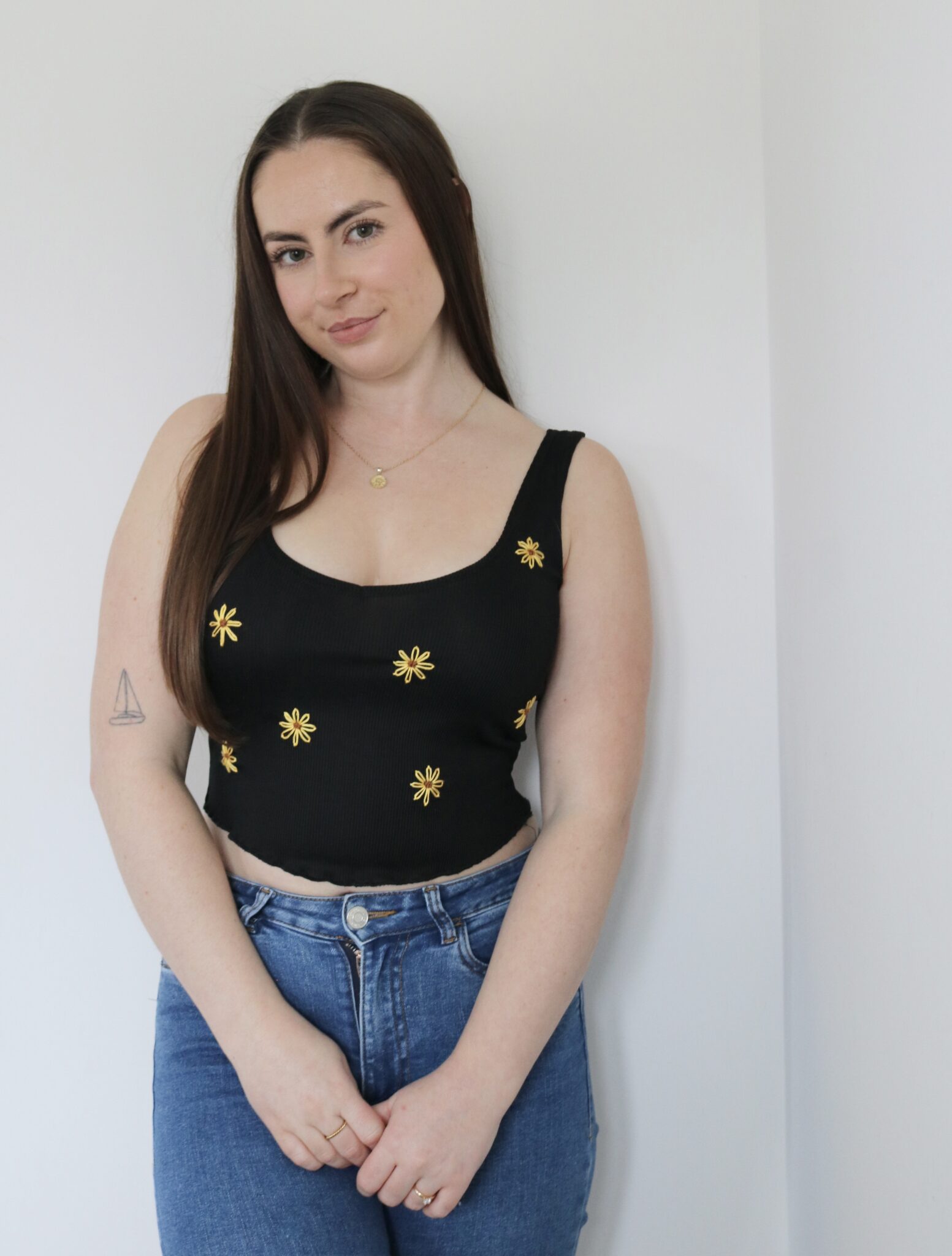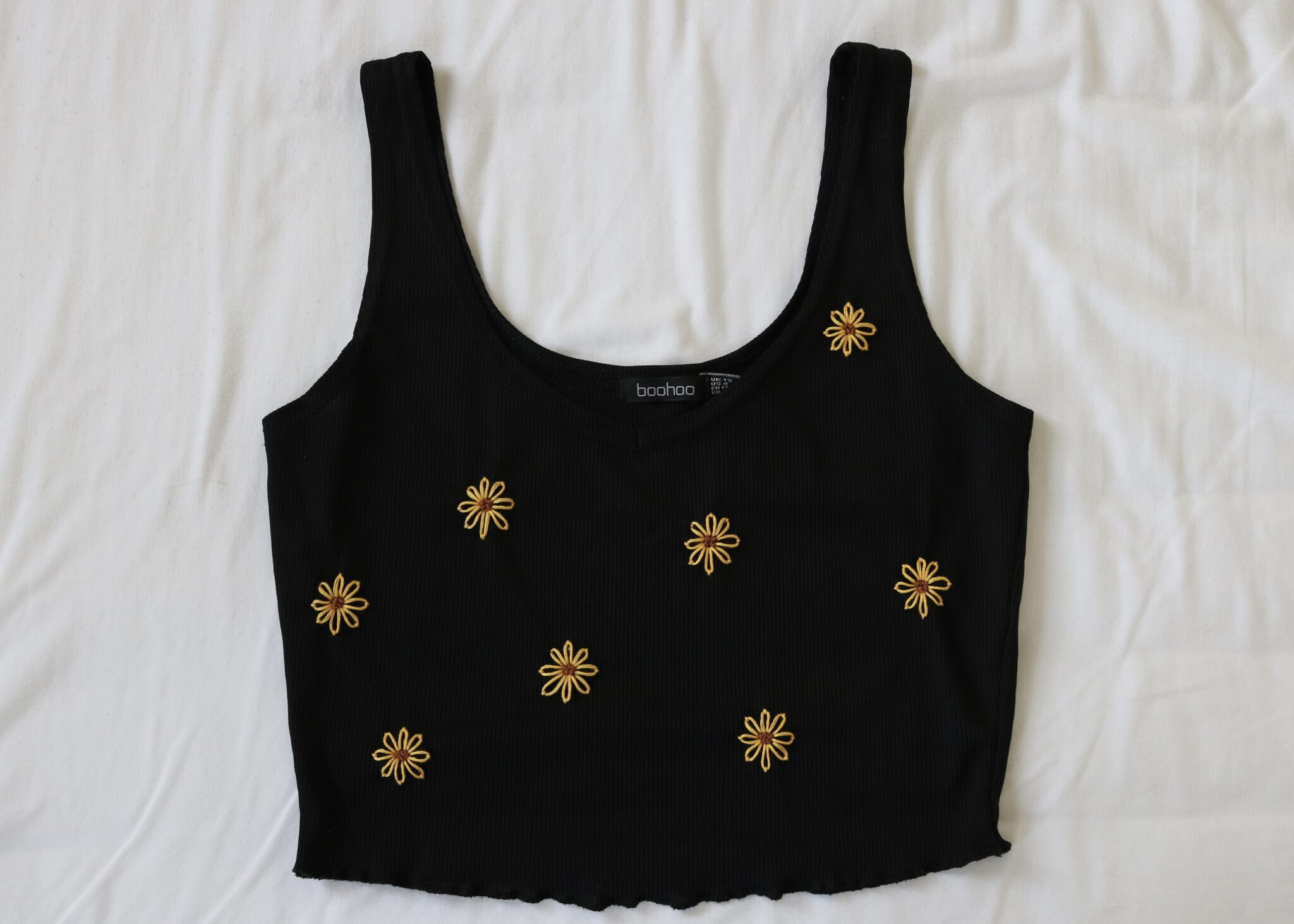 This sunflower embroidered crop top is a one-of-a-kind reclaimed piece. It is designed to feel playful, wearable, and full of character. Made from a black cropped top with a soft frill edge, it blends a flattering, easy silhouette with delicate hand-stitched detail.