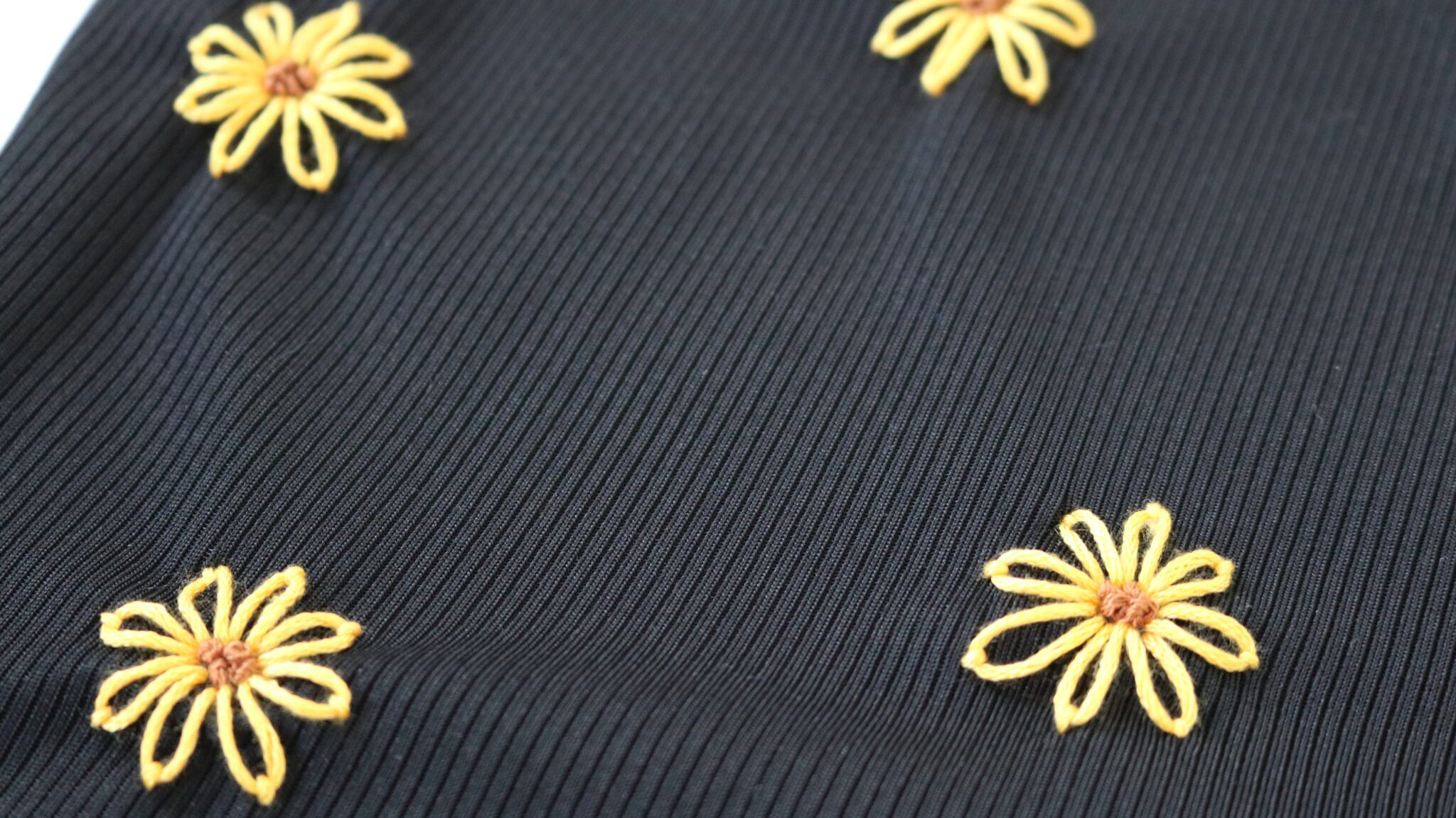 Scattered across the fabric, small sunflowers are embroidered by hand, creating a light, effortless design that feels naturally placed. The warm tones of the sunflowers stand out beautifully against the black background. It gives the piece a soft, sunlit contrast that catches the eye without feeling overpowering.