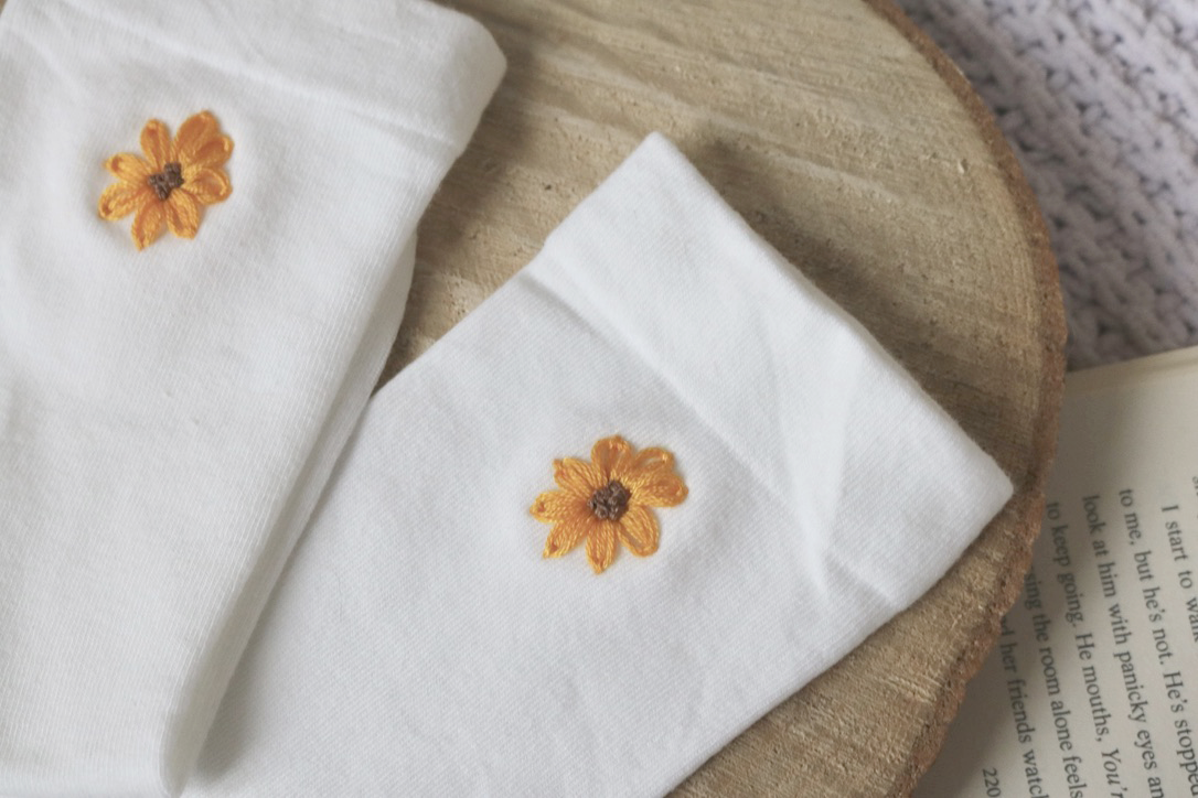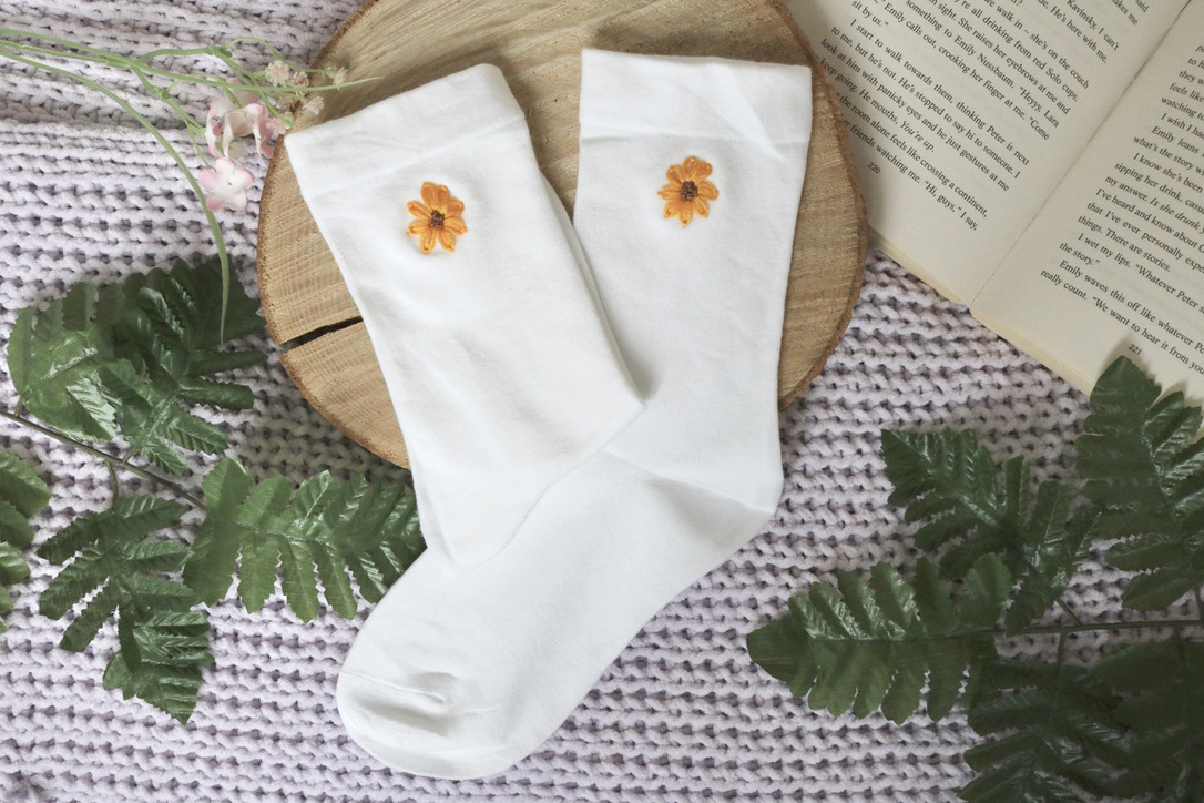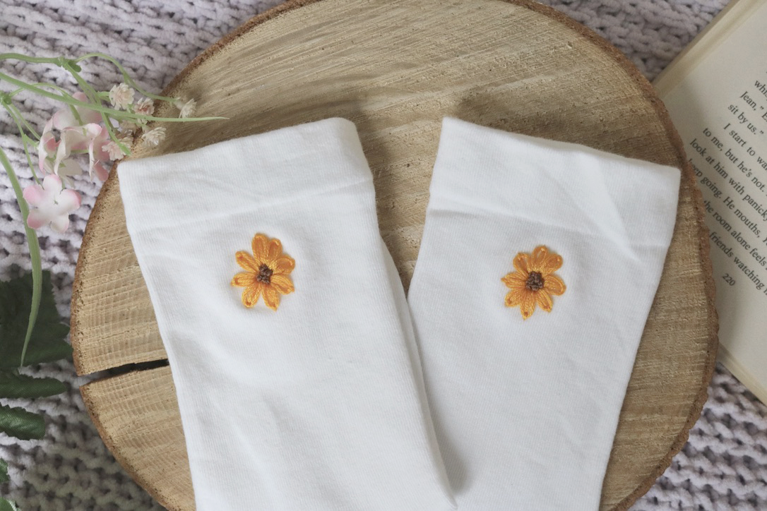 Made from white cotton socks and hand embroidered with yellow sunflowers on each sock, this pair feels bold yet easy to wear. The vibrant yellow embroidery adds a joyful pop of colour, whether styled with trainers, sandals, or peeking out from under turned-up jeans.