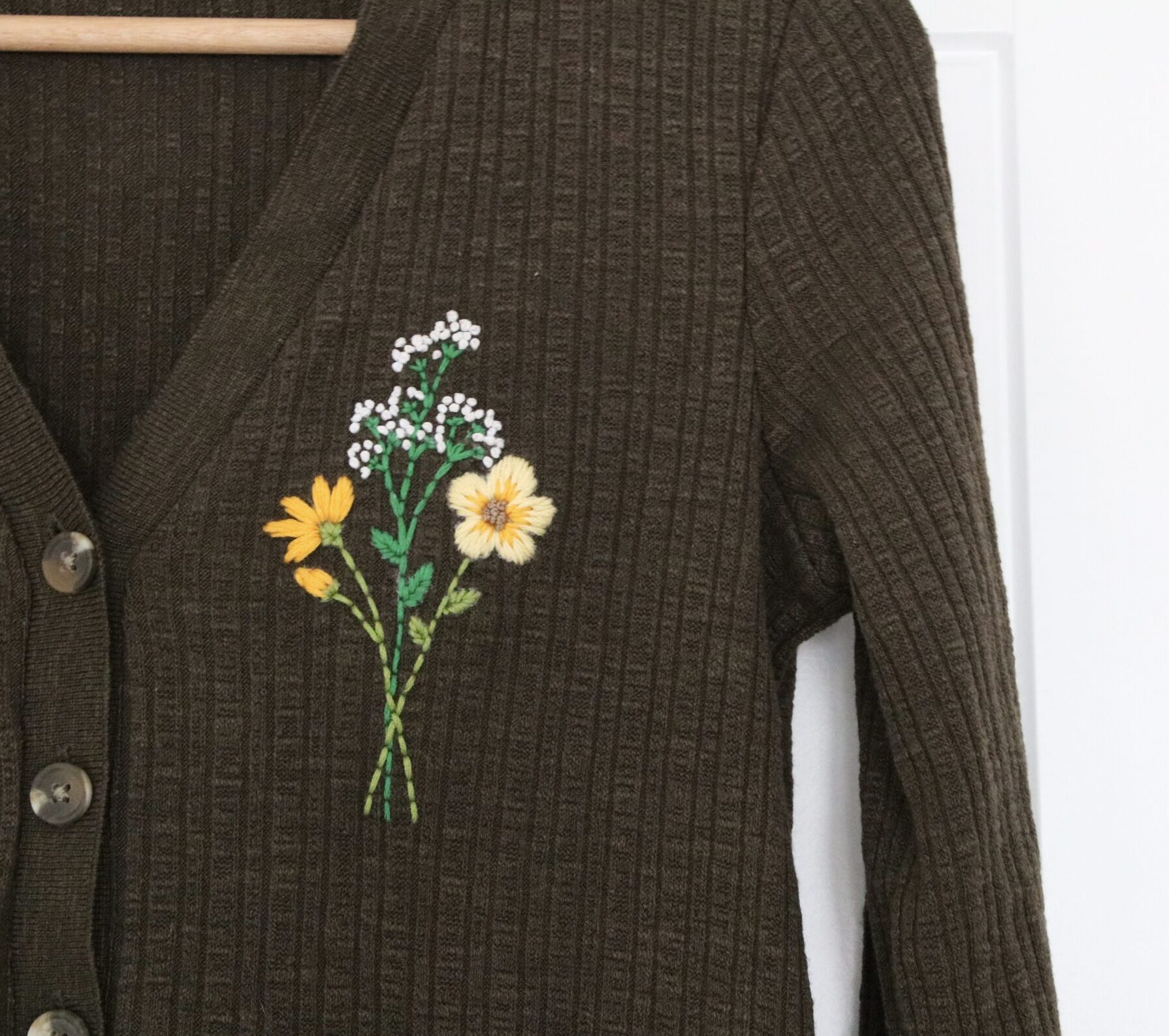 Sunset Blooms is a hand embroidered cardigan that effortlessly blends cozy comfort with vibrant botanical elegance. This khaki-hued delight is meticulously hand embroidered with a beautiful bouquet featuring delicate gypsophila, the warmth of yellow blanket flowers, and the fiery hues of orange cosmos. Each stitch is embroidered with love, creating a visual symphony of nature’s beauty.
