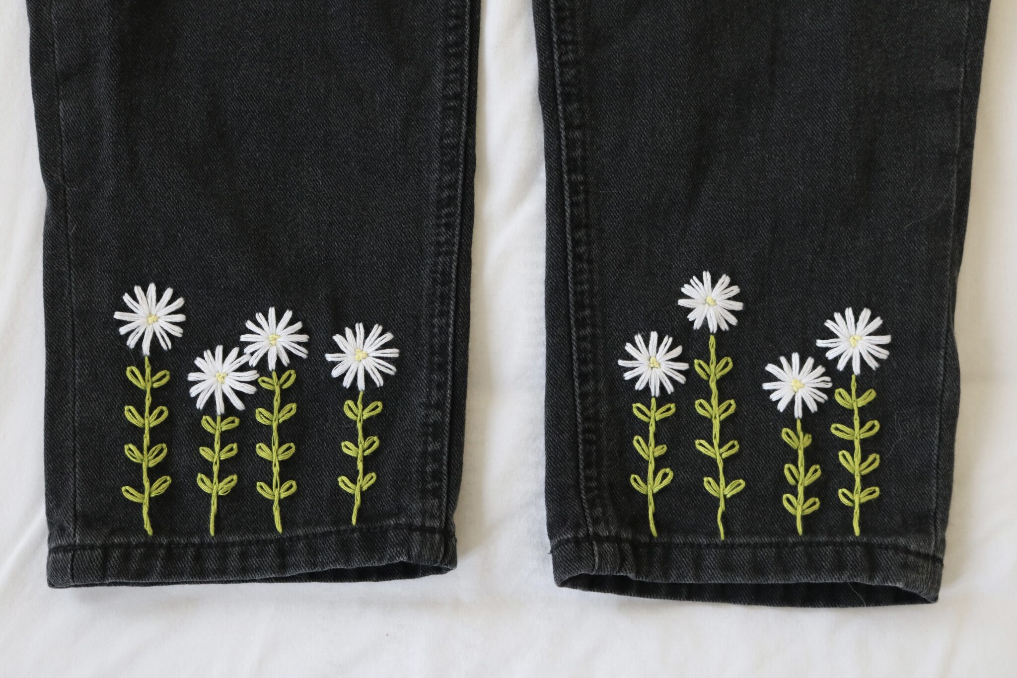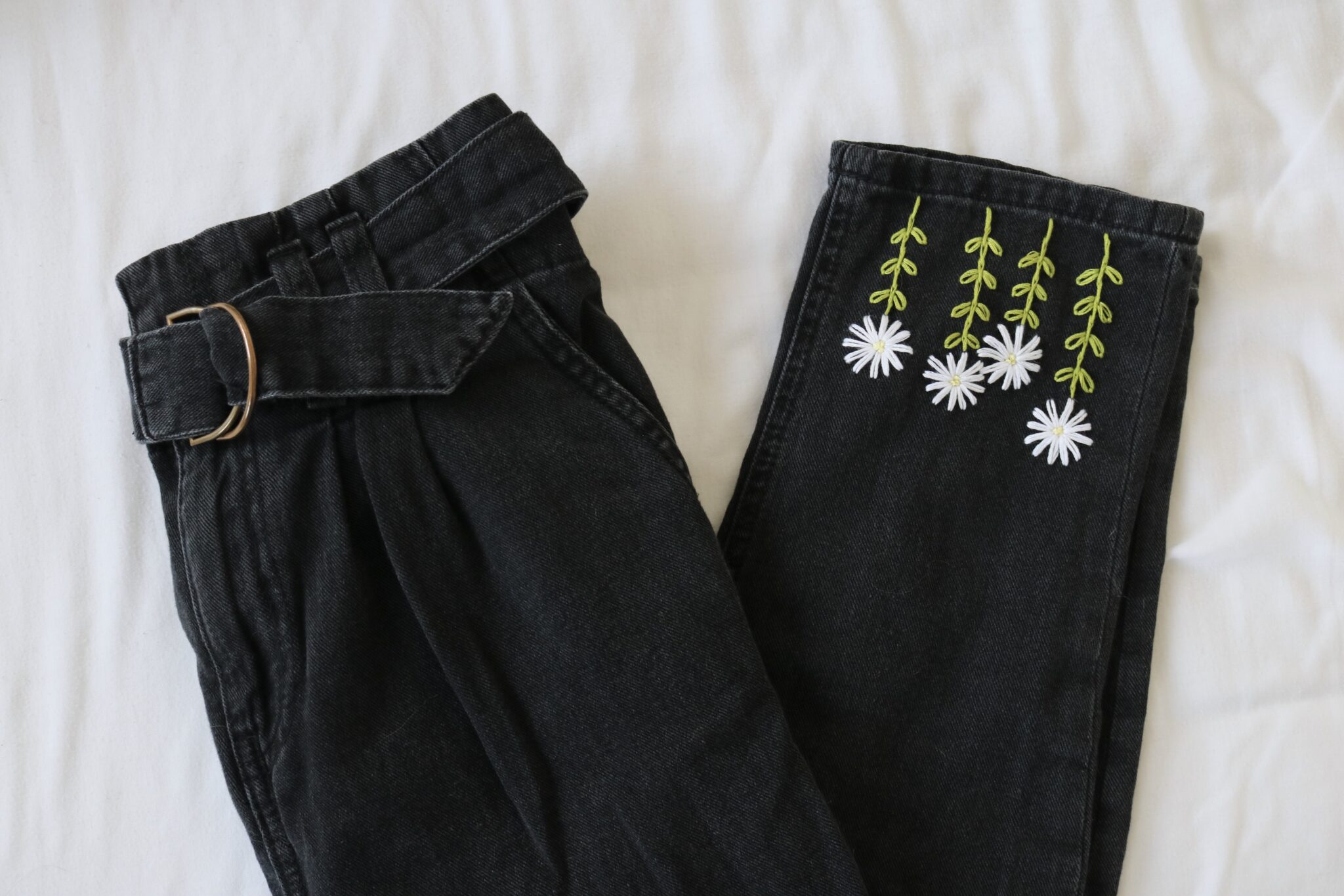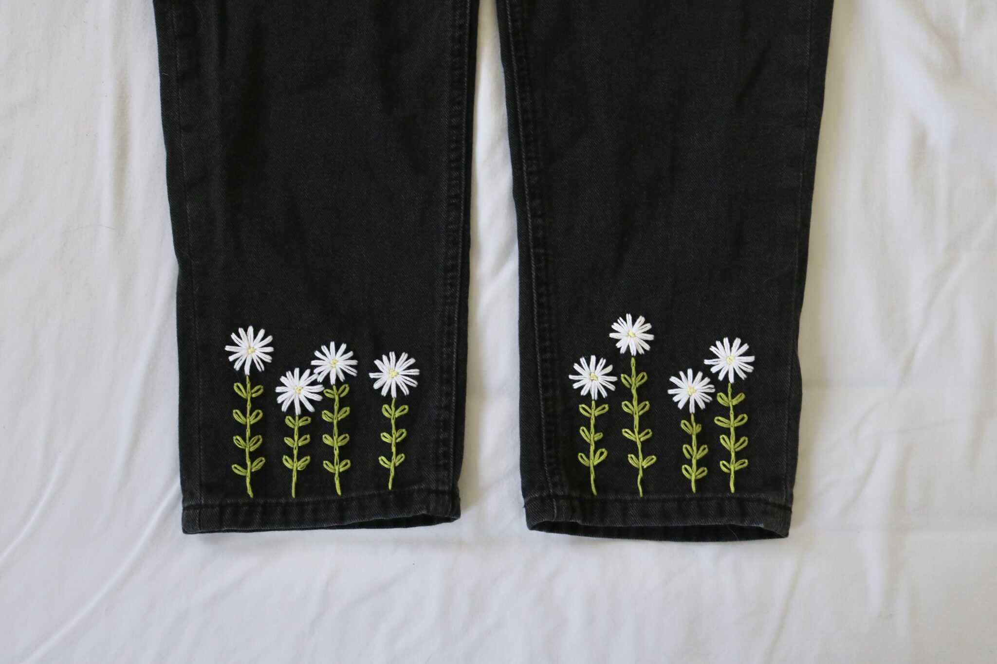 Your jeans will be created using a black mom jean style in your chosen size. Each pair is embroidered by hand after purchase, with the same daisy design carefully stitched onto both legs.