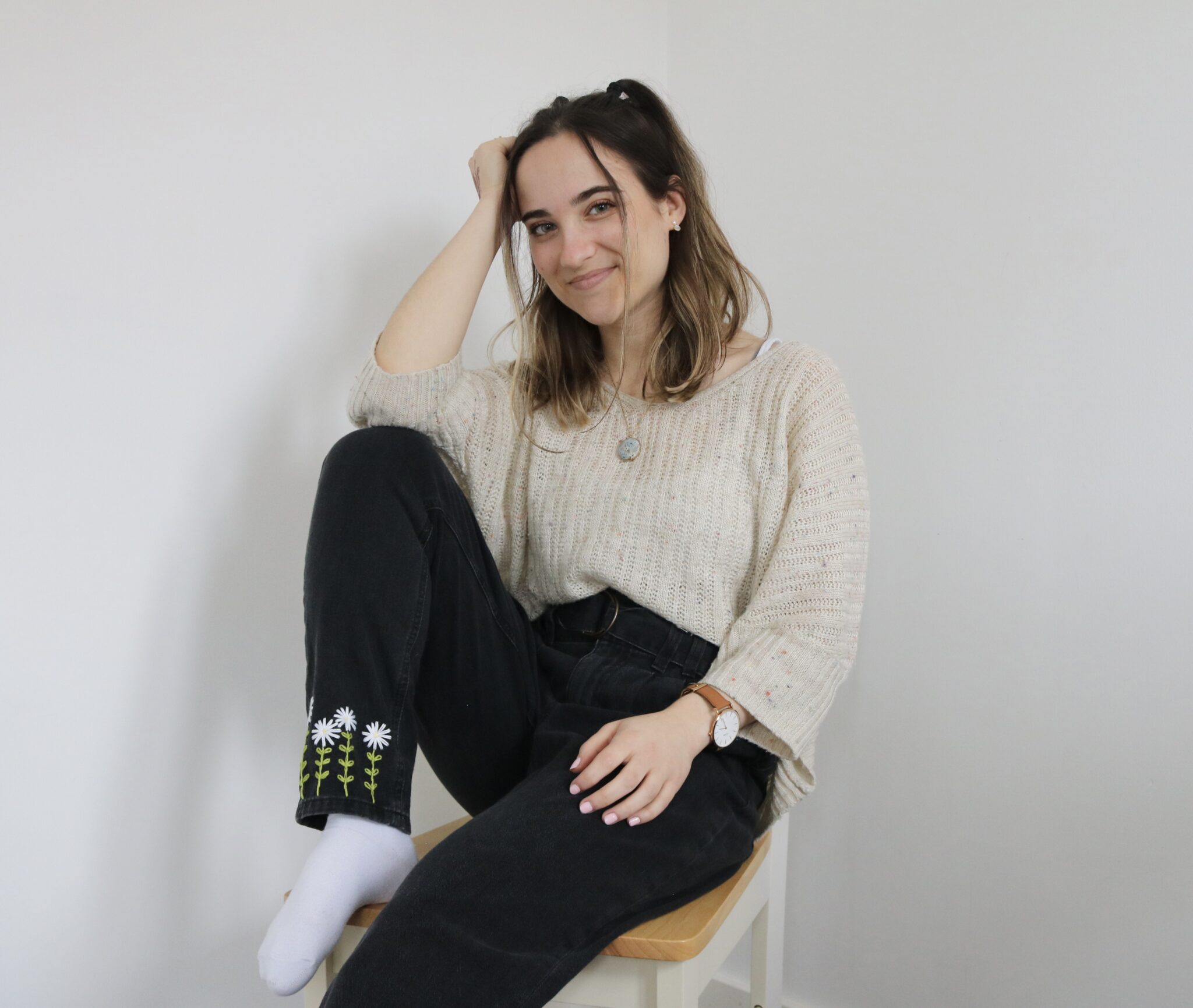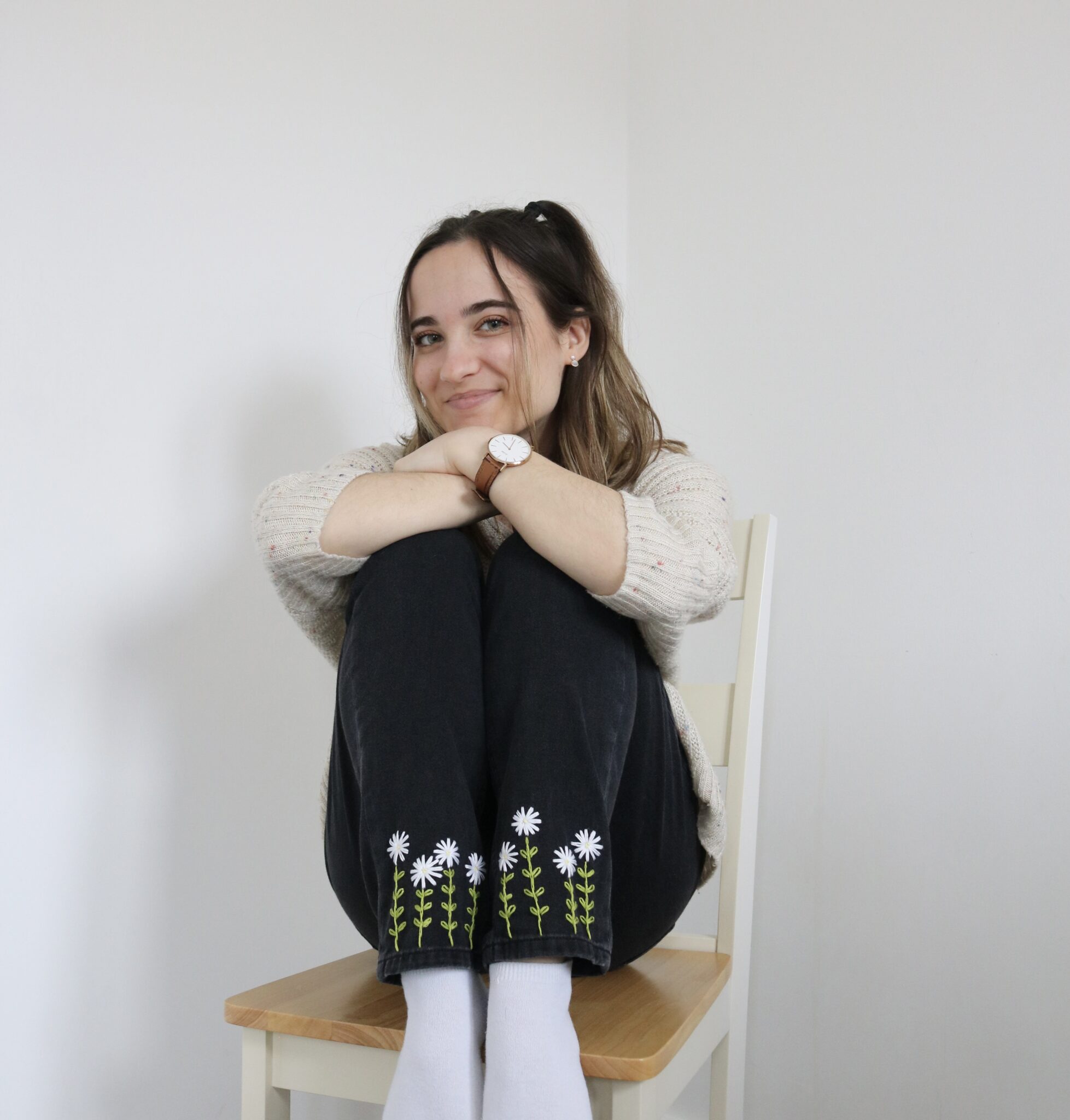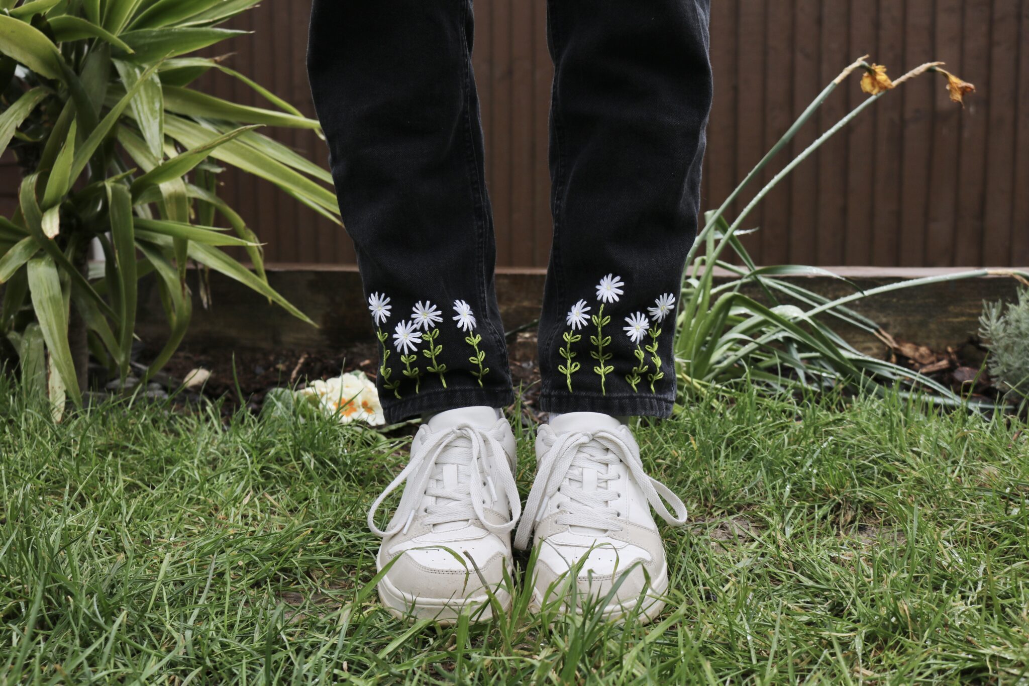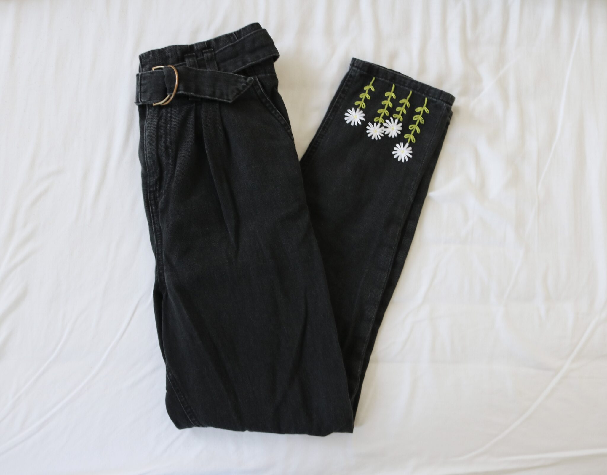 Your jeans will be created using a black mom jean style in your chosen size. Each pair is embroidered by hand after purchase, with the same daisy design carefully stitched onto both legs.