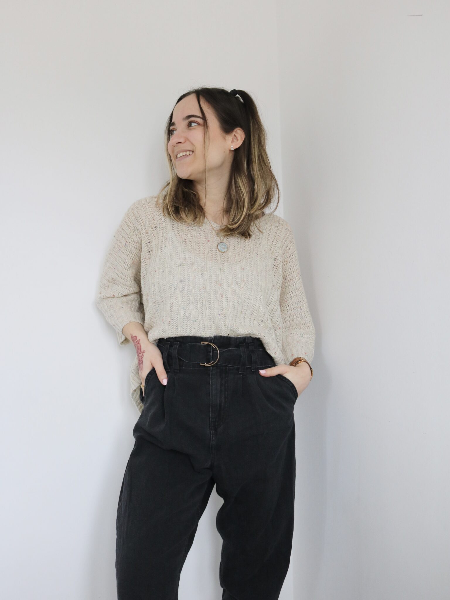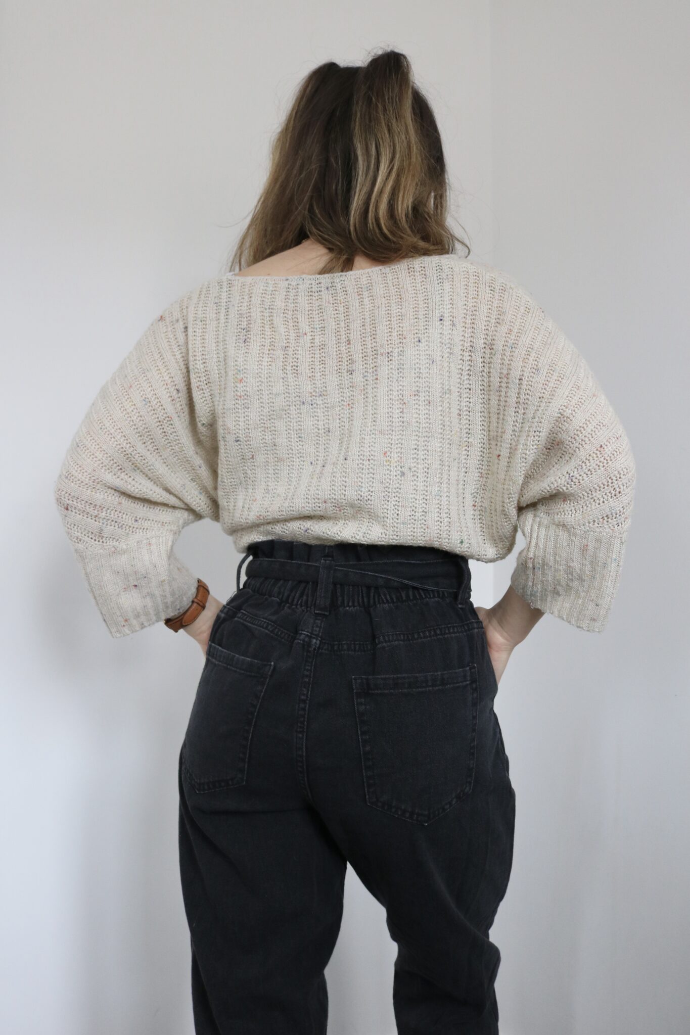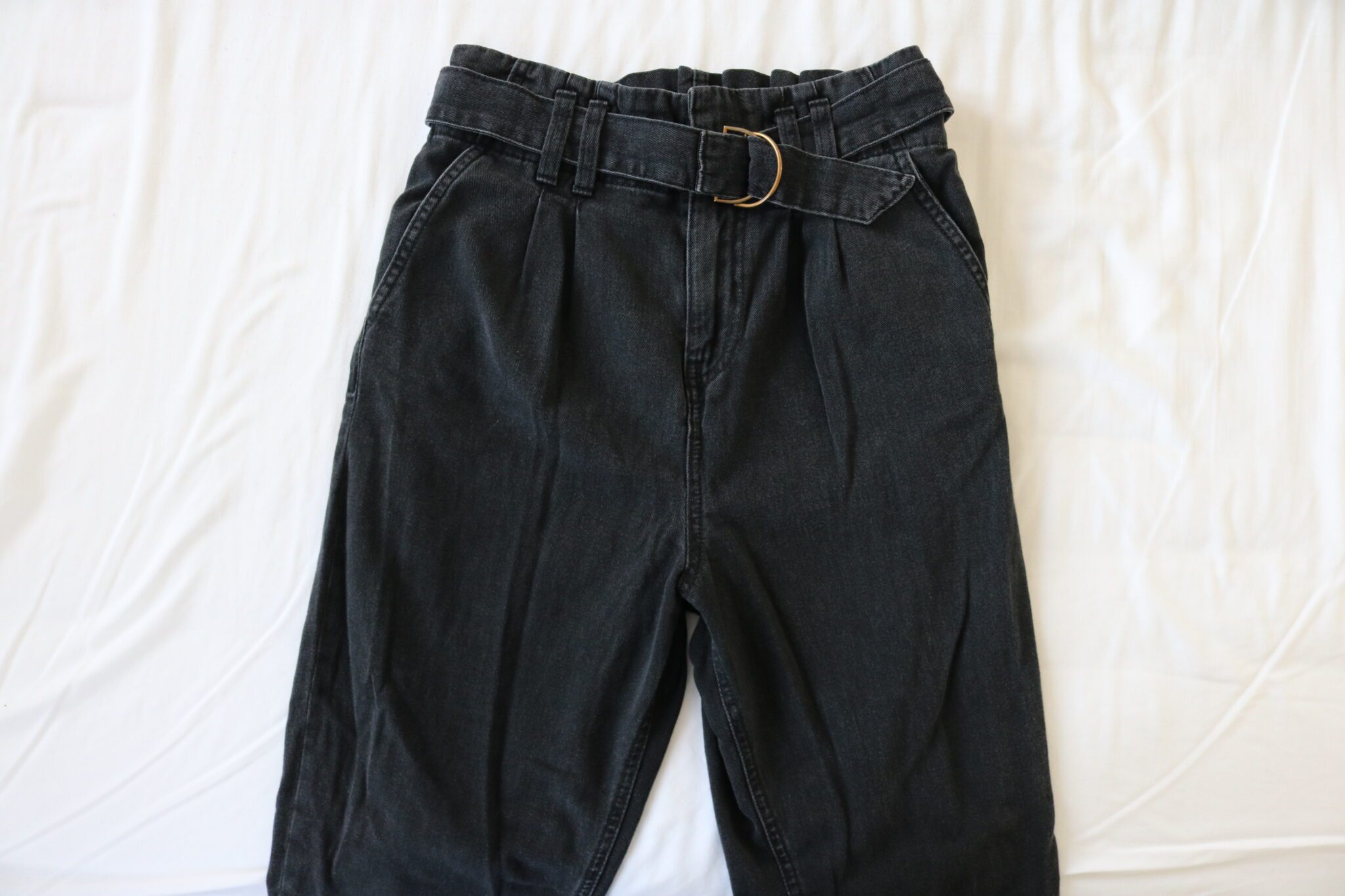 A one-off pair of thrifted black paperbag style jeans in a UK size 8, available at a reduced price. This pair is already embroidered and ready to send, making it a more sustainable and affordable option. - Made to Order: